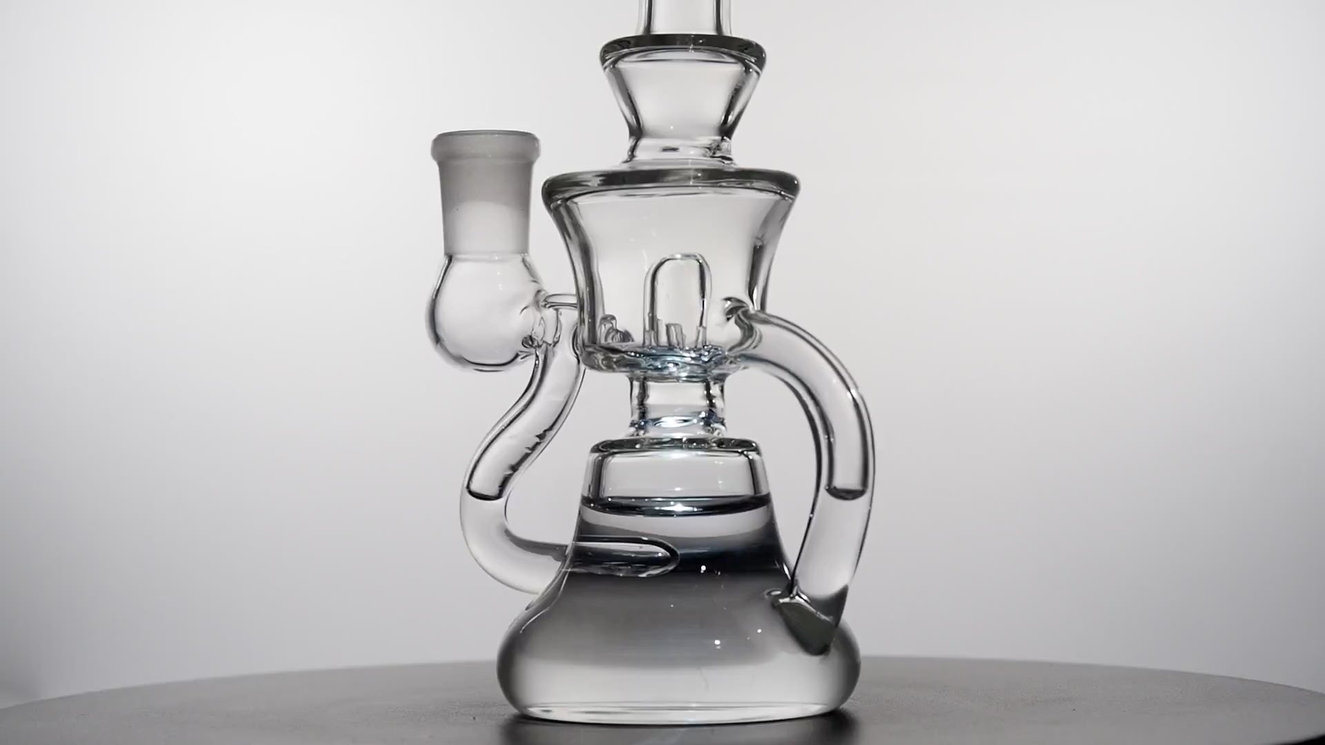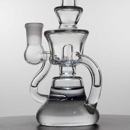 Intricately designed 6.8" Recycler made with crystal clear glass to allow you to fully capture the flow of this piece. With an inline diffuser perc and multiple interconnected chambers, this piece filters and purifies to reduce harshness and create a clean hit every time.