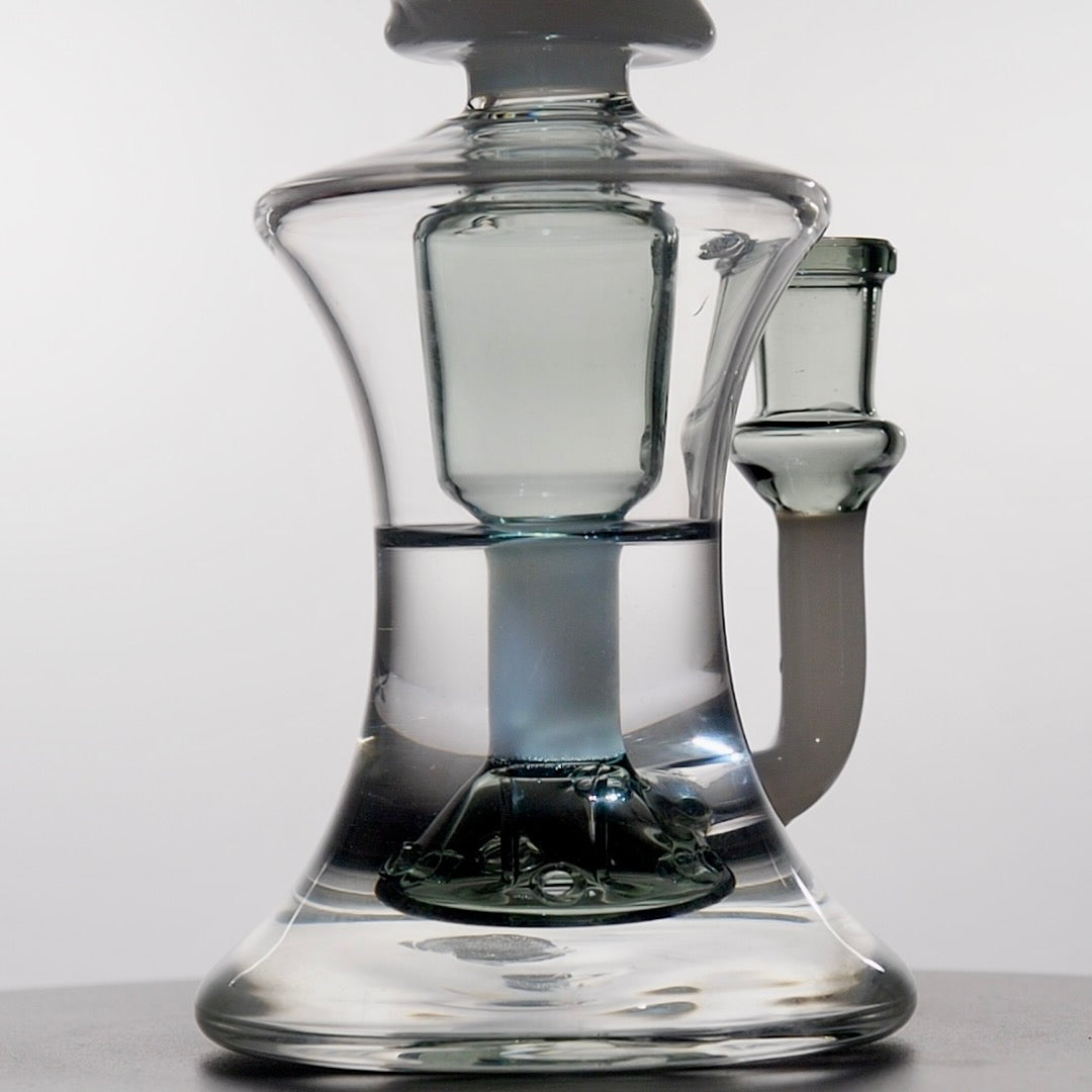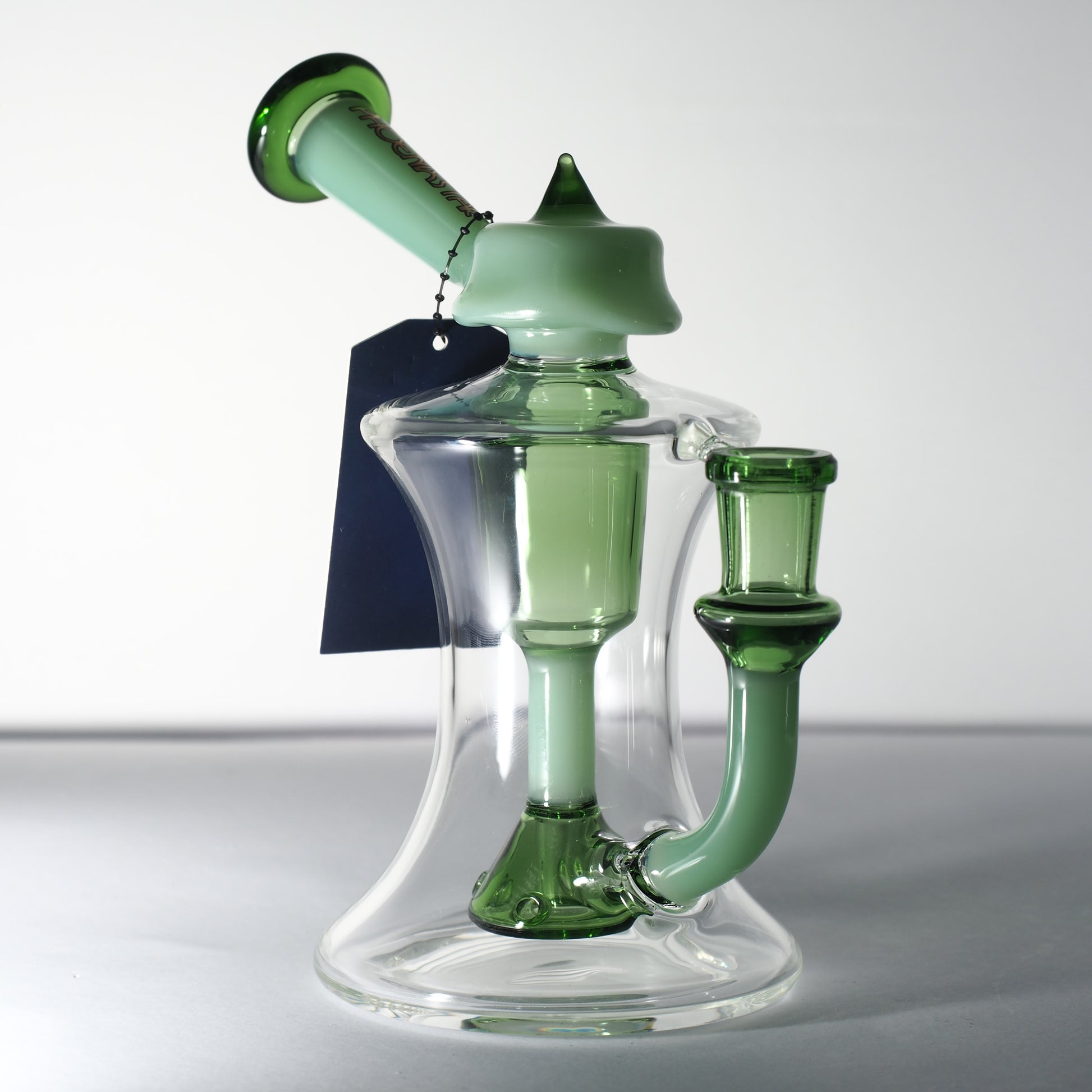 This 6.5" Recycler Oil Rig has a showerhead perculator which makes it a small but mighty rig. It is the perfect size for both home use and travel. Crafted using different techniques and glass, this visually stunning piece combines both opaque and clouded glass of different colours to create a unique contrasting finish. Available in a stunning green and a sleek black and white.