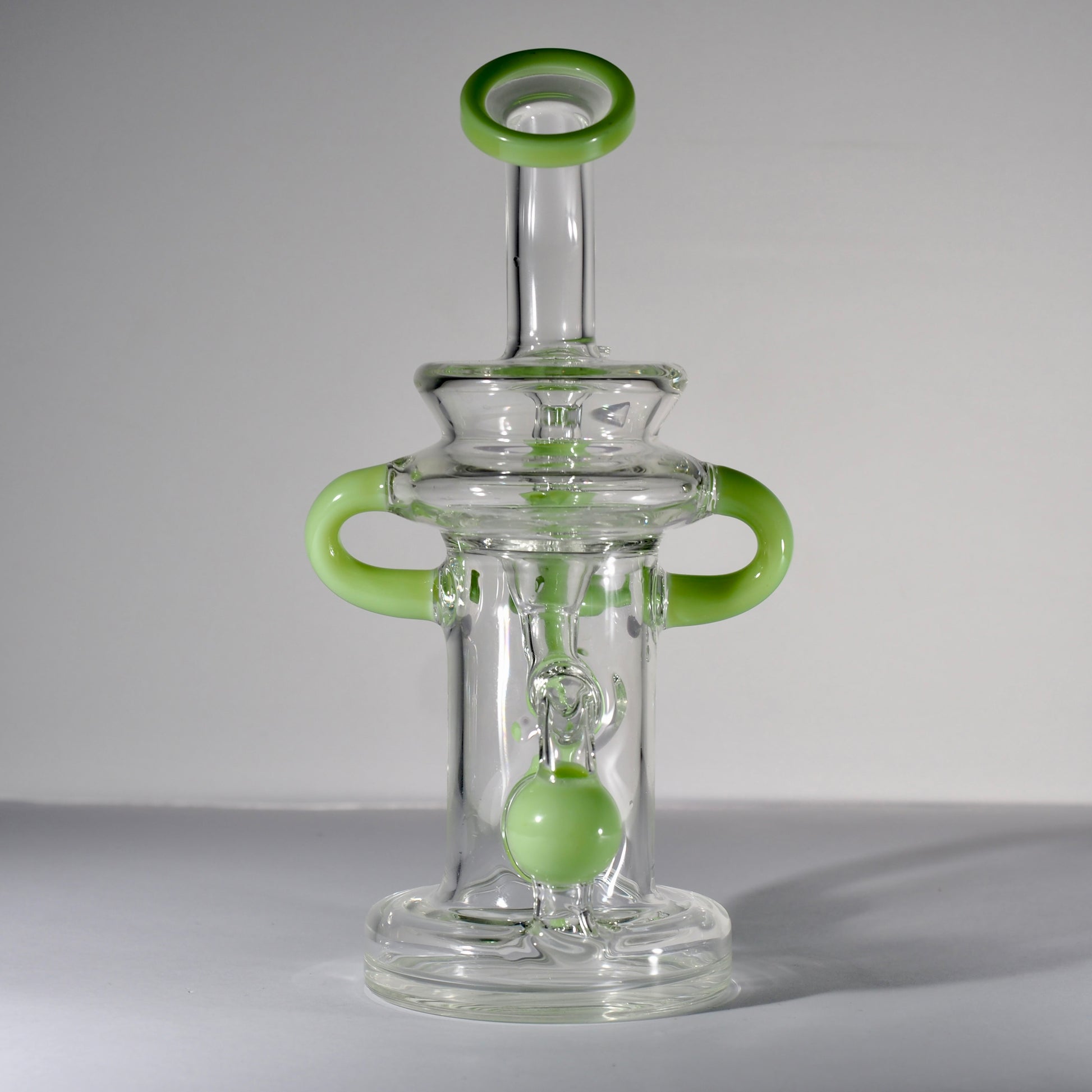 This dual uptake recycler rig stands out with vibrant green highlights and top‑tier filtration. Its dual uptakes keep your draws endlessly smooth, while the recycler action cools and spins every hit. Outfitted with a solid 14 mm joint and a matching bowl for instant, ready-to-go function.