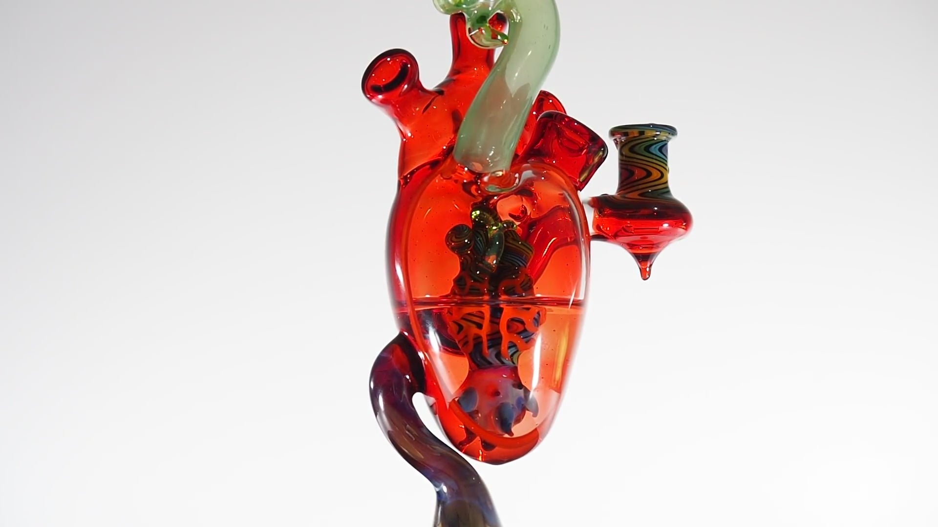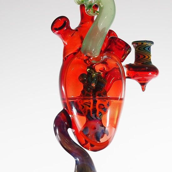 The heart sculpture is beautifully executed, giving this rig a one-of-a-kind presence on any glass shelf. A vibrant wig wag finish flows through the mouthpiece and joint, tying the whole piece together in true heady fashion.