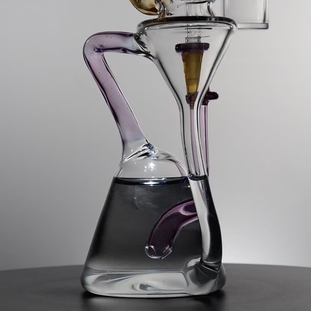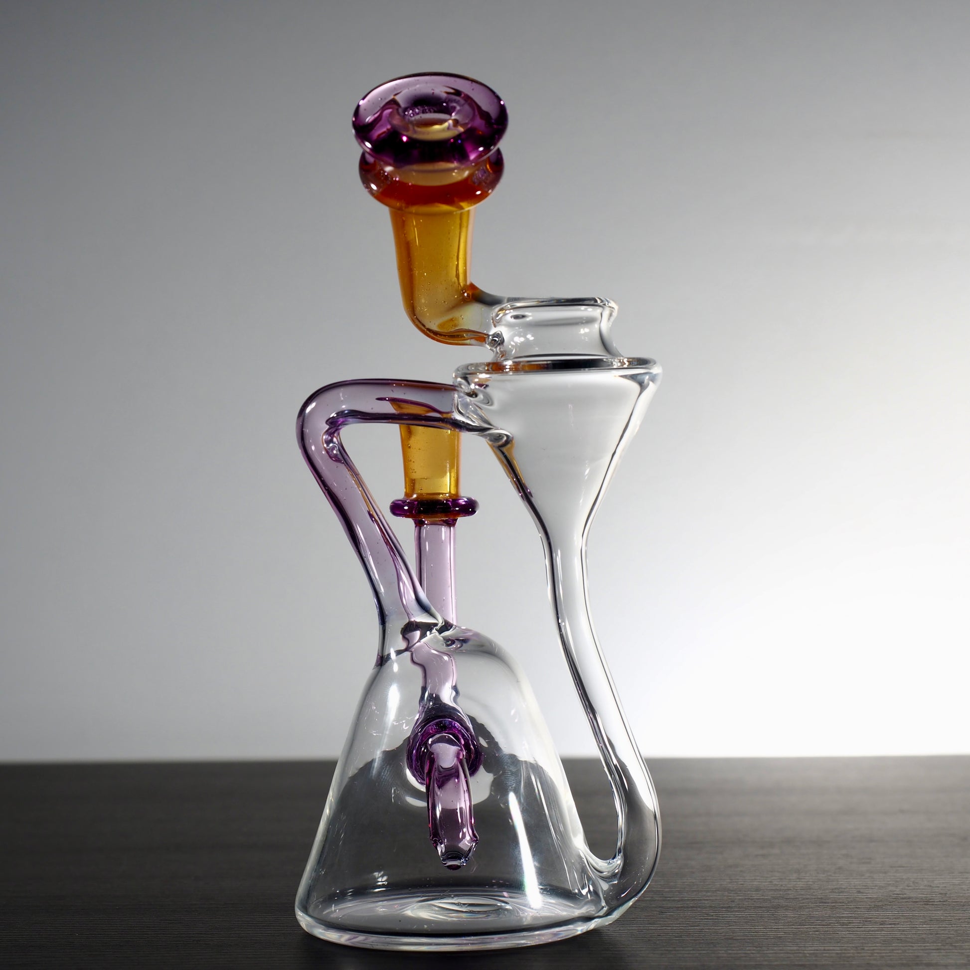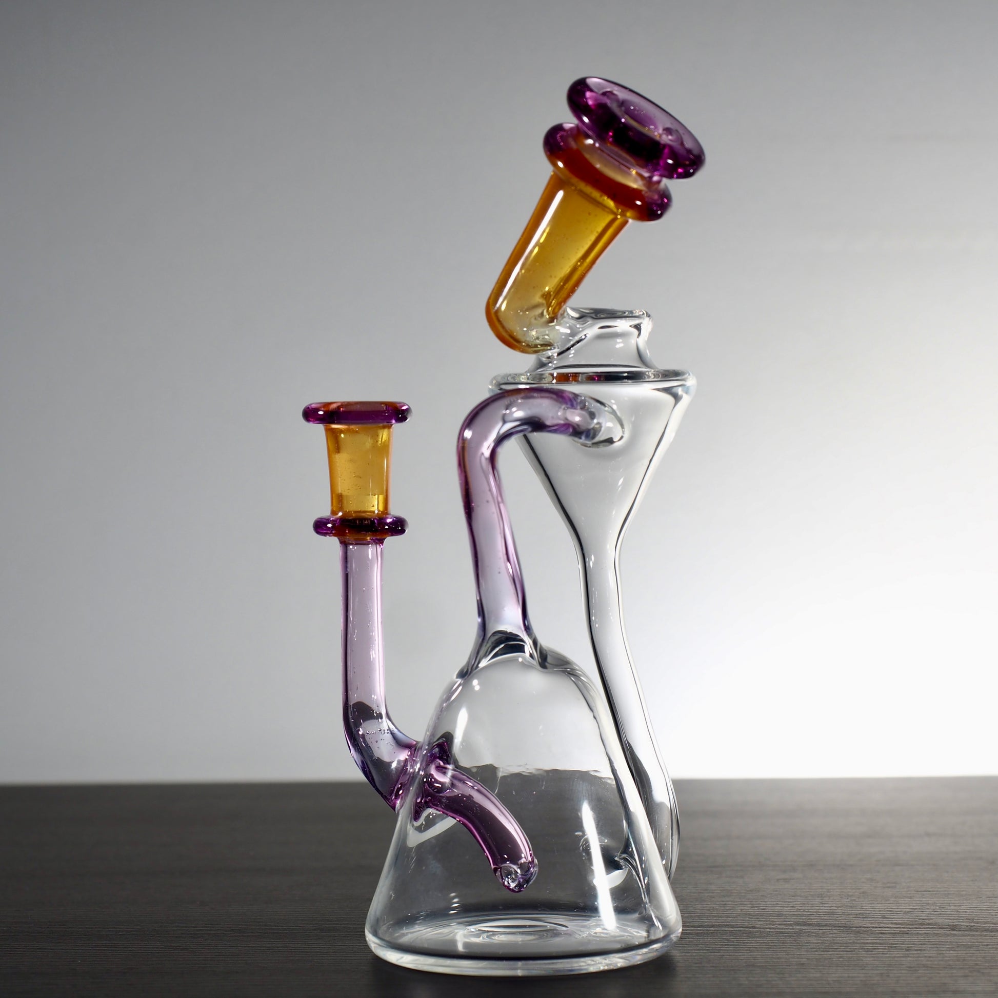 Man Child Glass Accented Side-Saddle Recycler in gold purple and tangelo. This piece features a 10mm joint and a 2-hole diffuser for killer function. Great for smooth draws and stylish presentation.