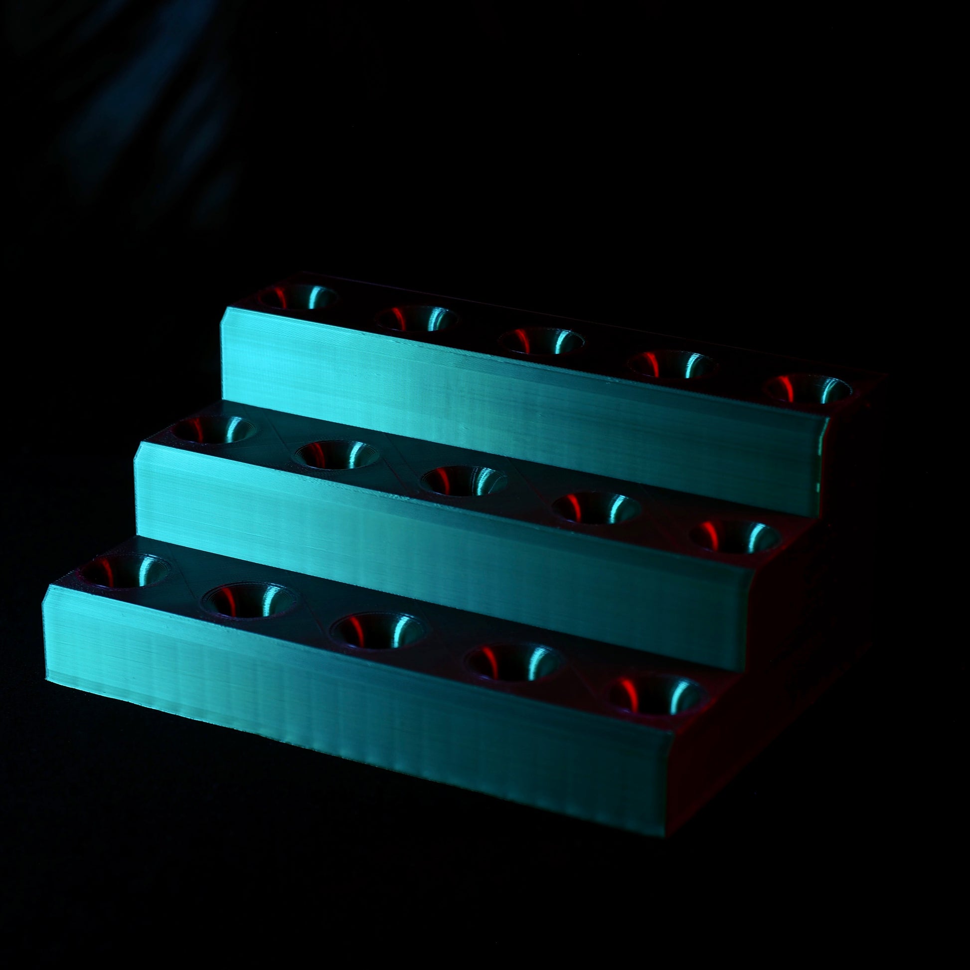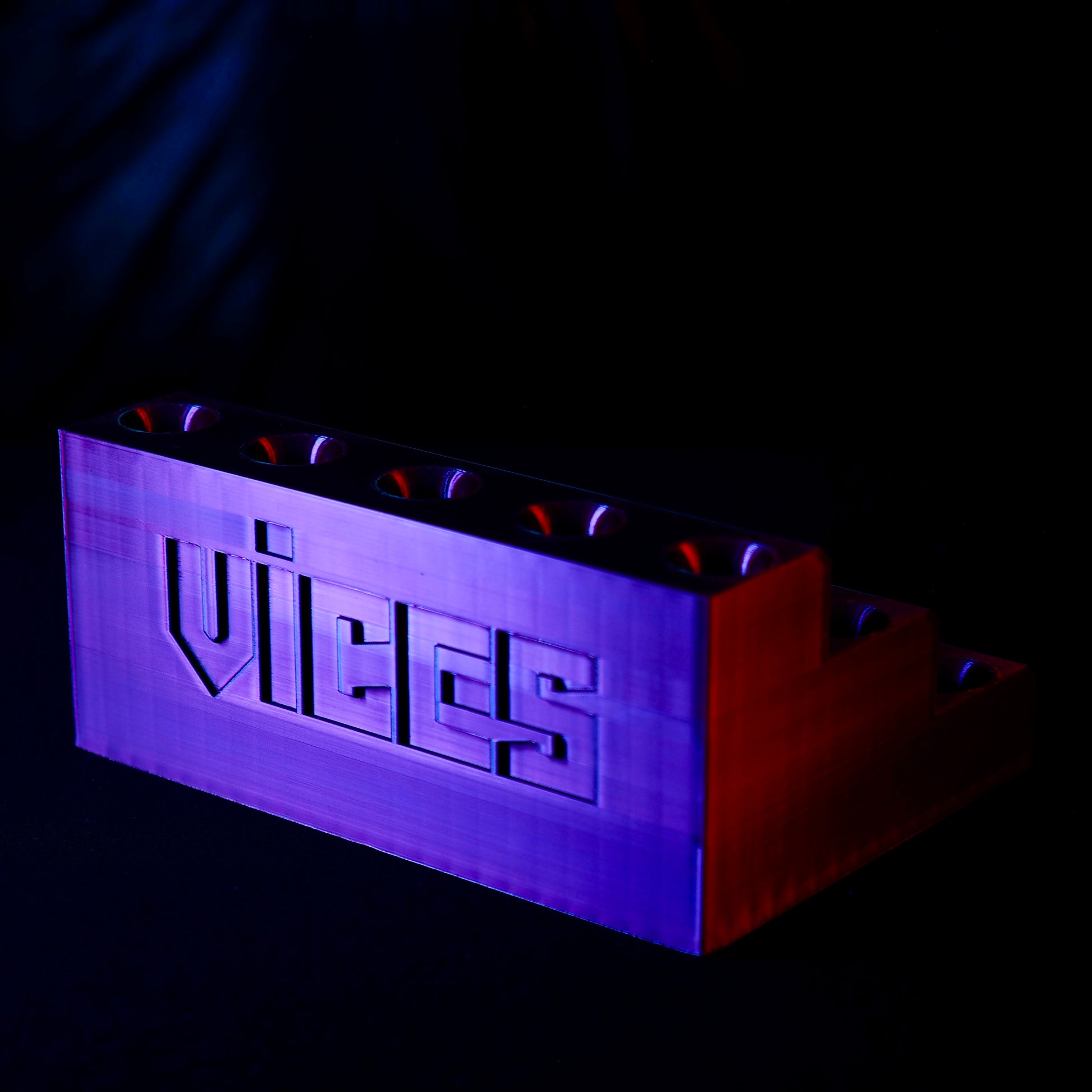 Each of the 15 precision 14 mm pockets keeps your glass upright, safe, and ready to grab, while the stepped block profile shows everything off instead of hiding it in a cluster on the tray. Finished with a bold VICES logo stamped into the back, it doubles as both storage and a flex piece on any desk or shelf.