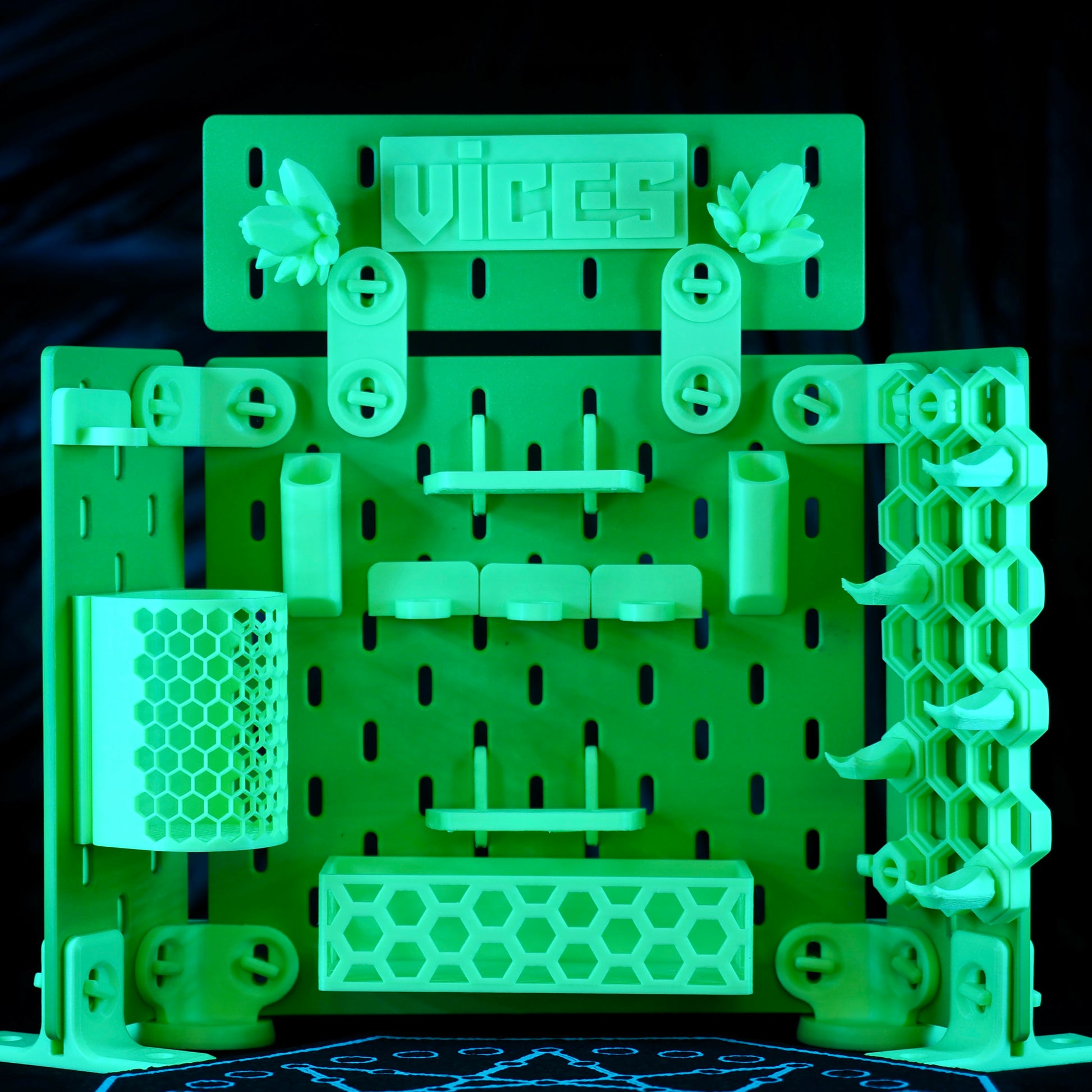 Channel the raw energy of the Kryptonite AdaptaWall - dark and neon green hues fuse with crystal accents to give a radioactive, otherworldly aesthetic. Turn down the lights to see the true power of this Adaptawall as the neon green surfaces light up with a luminescent glow. A mystical centrepiece for your Battlestation, balancing natural energy with a supernatural presence.